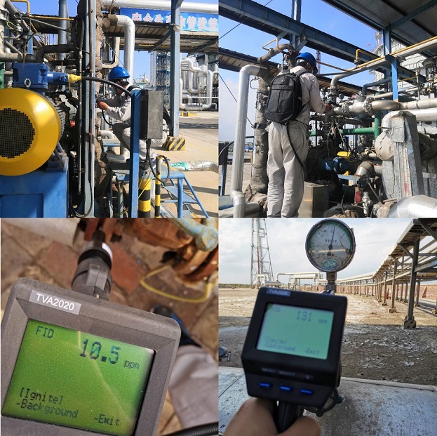 HSE工程師田永振解讀了公司下發(fā)的LDAR檢測(cè)管理制度,并對(duì)檢測(cè)儀器的配件組成、使用方法進(jìn)行了細(xì)致的講解。隨后帶領(lǐng)各裝置工程師到污水裝置進(jìn)行自檢教學(xué),首先將檢測(cè)儀器在可能泄漏的設(shè)備表面確定檢測(cè)點(diǎn)位,并將采樣探頭對(duì)準(zhǔn)檢測(cè)點(diǎn)位,將檢測(cè)儀置于度數(shù)最高值處并在儀器響應(yīng)時(shí)間內(nèi)至少讀數(shù)兩次,記錄最大值為此處檢測(cè)得到的泄漏值。此次檢測(cè)共查出6項(xiàng)泄漏點(diǎn),并記錄在LDAR自行檢測(cè)臺(tái)賬,其中5項(xiàng)均已整改完成,1處掛牌。隨后各裝置工程師按照公司及部門的要求對(duì)裝置區(qū)易泄漏區(qū)開(kāi)始進(jìn)行自檢,將泄漏檢測(cè)結(jié)果列入臺(tái)賬整理,周期為7天。