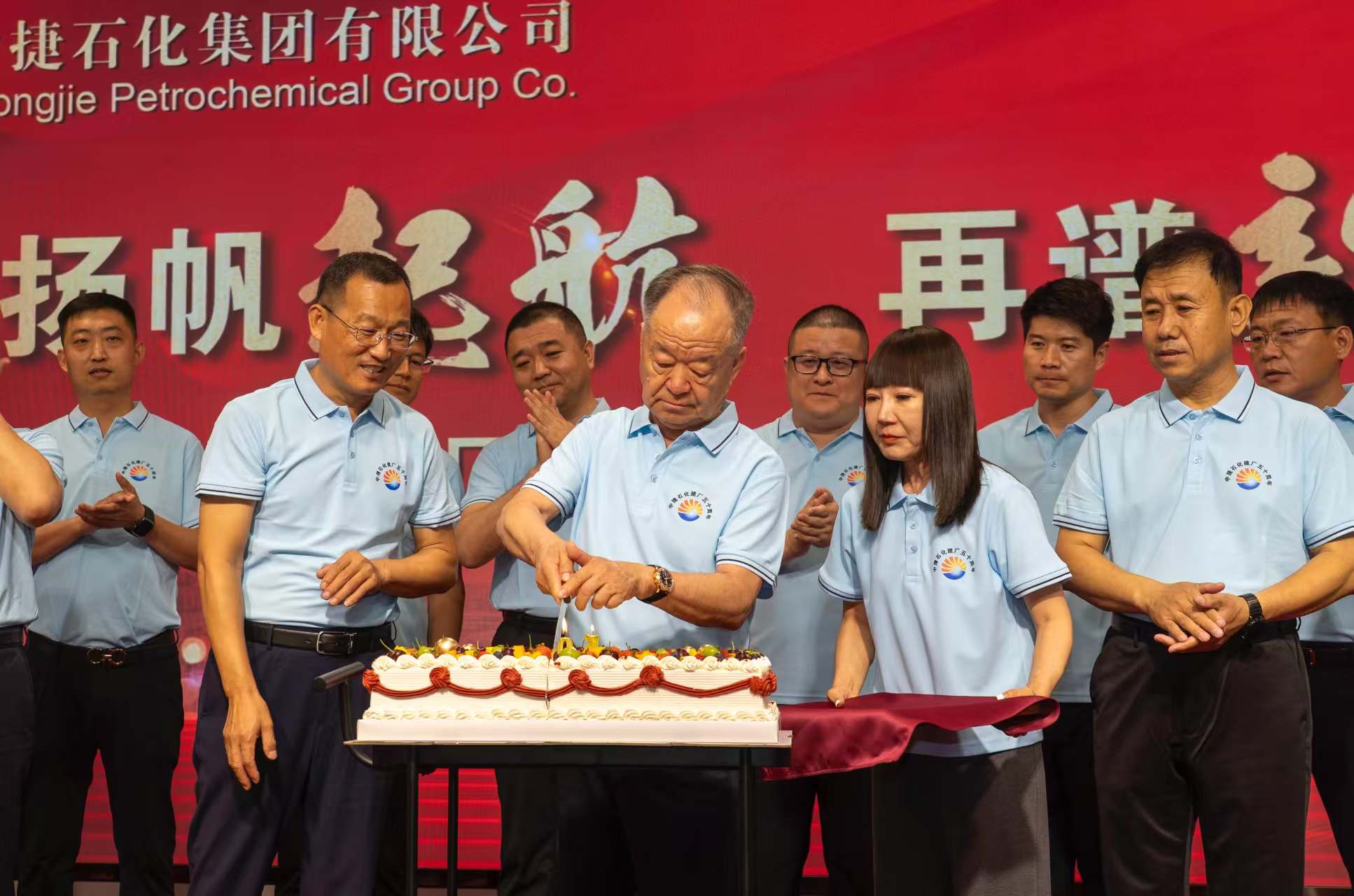 隨后,在溫馨而莊重的氛圍中,集團董事長王振華,黨委書記于國臣,總經(jīng)理喬樹華等集團公司領導,各所屬單位董事長、總經(jīng)理共同上臺,全場齊唱生日歌,為中捷石化50歲生日獻上最美好的祝福。